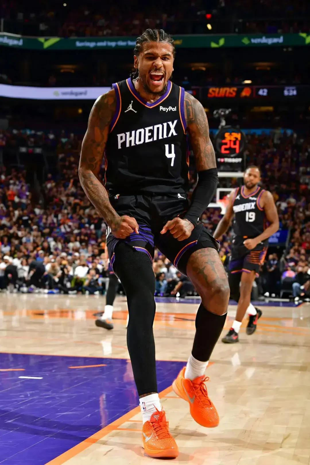 第一场输给开拓者的附加赛,杰伦-格林打得没什么毛病,甚至可以说打出了加盟太阳以来最好的一场球,他29投14中,拿到35分5篮板2助攻,末节一己之力把比分扳了回来,可惜最终投丢了绝杀三分。